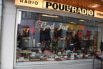 Electronics store decorated with “God Jul” or Merry Christmas, red hearts and Christmas nisser