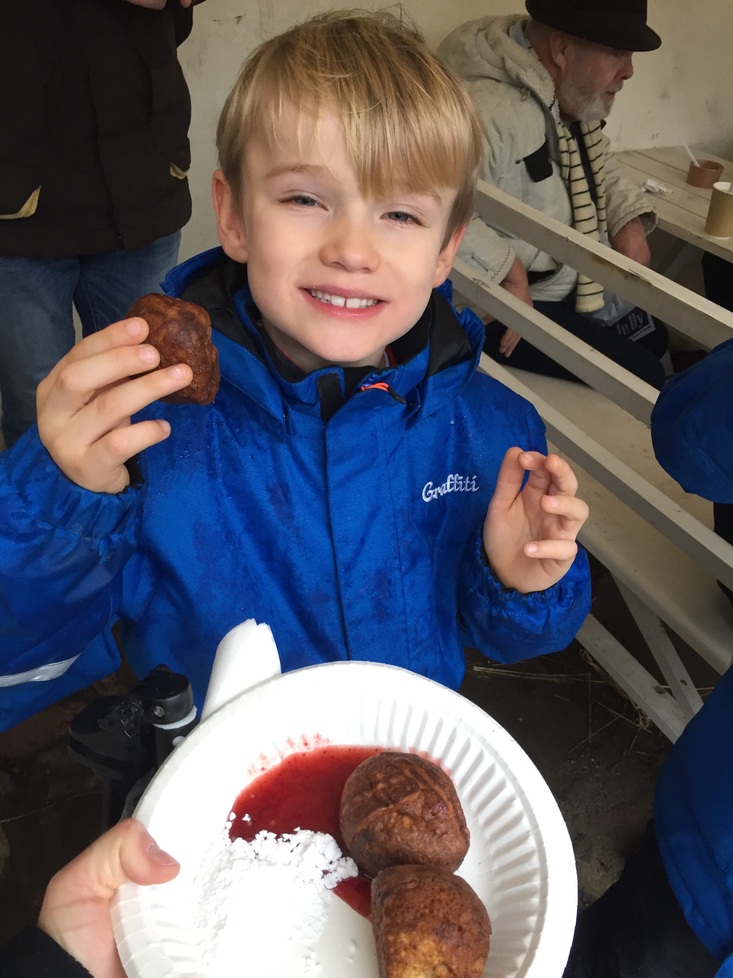 Æbleskiver with jam and powered sugar at Den Gamle By at Christmas