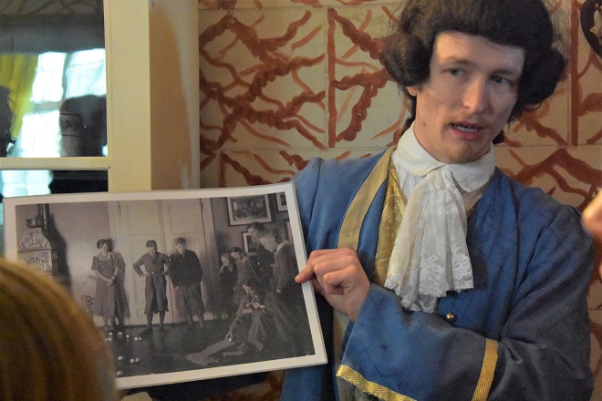 As we reached what seemed to be the second floor, a man in a traditional costume greeted us. I think he said his clothes (and wig) were all the rage during the 1700s. My oldest son said he looked like George Washington. This made me happy, considering he remembered what George Washington looked like and that he picked someone from the correct time period. Way to go, dude!