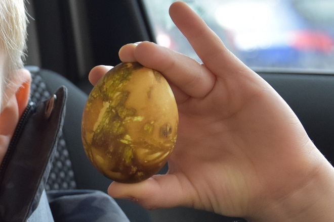 As we unwrapped our eggs, we saw that it did work. The eggs were not pink or blue, but they were a yellowish-greenish-brown color. Obviously, had I seen an egg with such a color, I would not have eaten it, but since I knew why it was that color (red onion peel), I loosened up a bit. I thought they were glorious! 🙂 I totally need to remember to post those on Pinterest later! The boys also felt proud of their work, which is the important part. They don’t even know what Pinterest is, so no pressure for them.