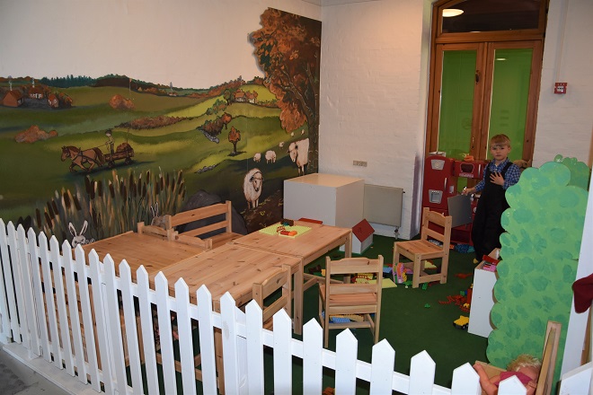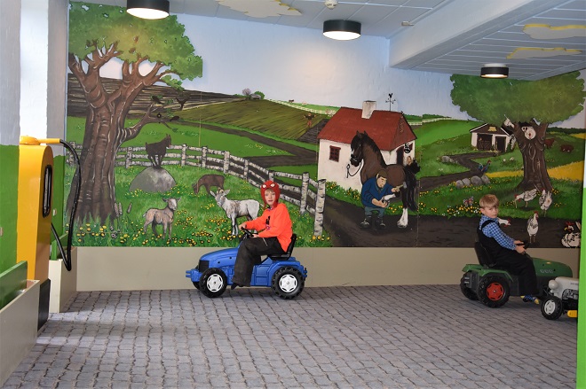 We were told that there was a playground in the area of the museum, but I didn’t see it. I just assumed it was my poor Danish skills that allowed me to hear the man incorrectly. When we walked into the building, I understood what he was saying. There was a large room, just inside the entrance that was the children’s play area. This was neat! They had staged it to have different sections to represent different aspects of farm life. The different areas included the fields, the farm house, the general store, and the tractor yard.