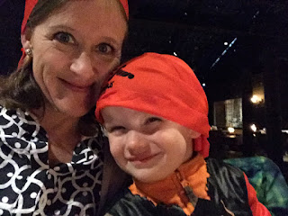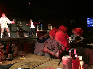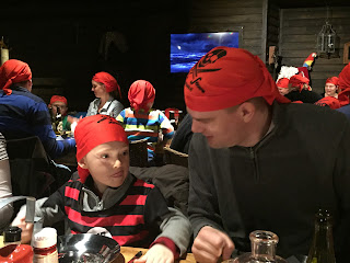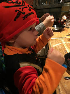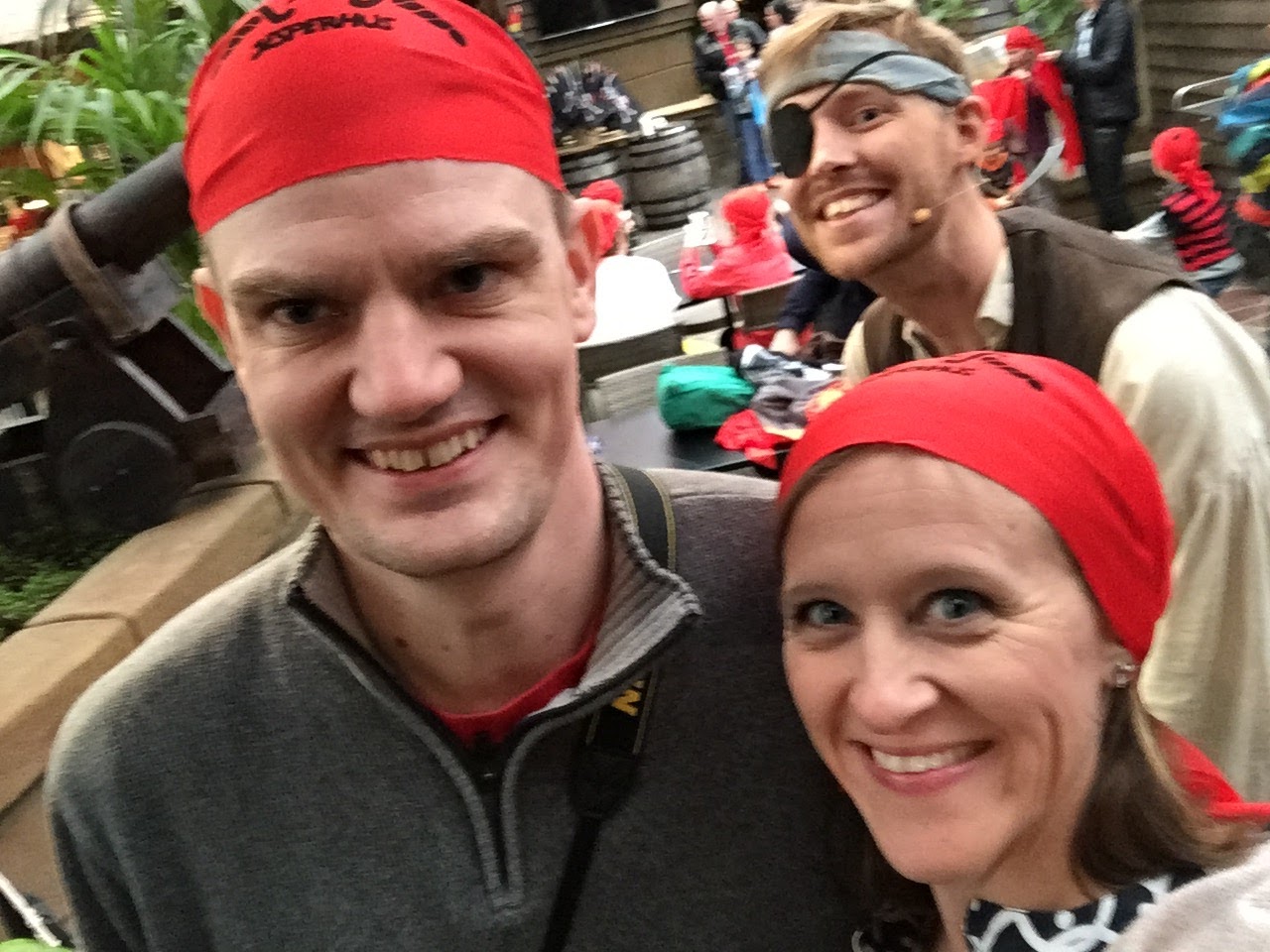 We decided to drive, since it was raining pretty hard by this time. The distance wasn’t very far from the activity center, but it was located in a separate section of the park. We were told to arrive at 5:30pm, which we did. After being checked in, we were given red bandannas to wear for the show. We were on the “red” team. I was happy for this, because red matched our pirate clothes! Haha! We waited in an open area that was decorated with lots of things pirate-y, and the boys ran around swishing their swords at other kids, having fun, being pirates. At about 10 to 6, we were told that we could go into the dining room.