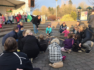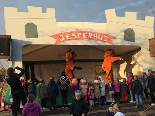 At 7pm, they started a bonfire in a pit in front of a small, outdoor theater. They had long sticks which you could use to make snobrød, or “twist bread”, which is usually dough wrapped around the end of the stick like a mummy and toasted over the fire. Though we didn’t make any bread, it was nice to be around a fire. In most Danish campgrounds (which this more-or-less was), you are not allowed to have a campfire. This one was no different, but it was an nice way for everyone to come together. At 7:30pm, Hugo the Bear and Rita the Fox came out to entertain the kids by singing, dancing and being silly. Both of my boys loved it! After the show, we made one more stop to the playground before going back to the cabin and getting ready for bed.