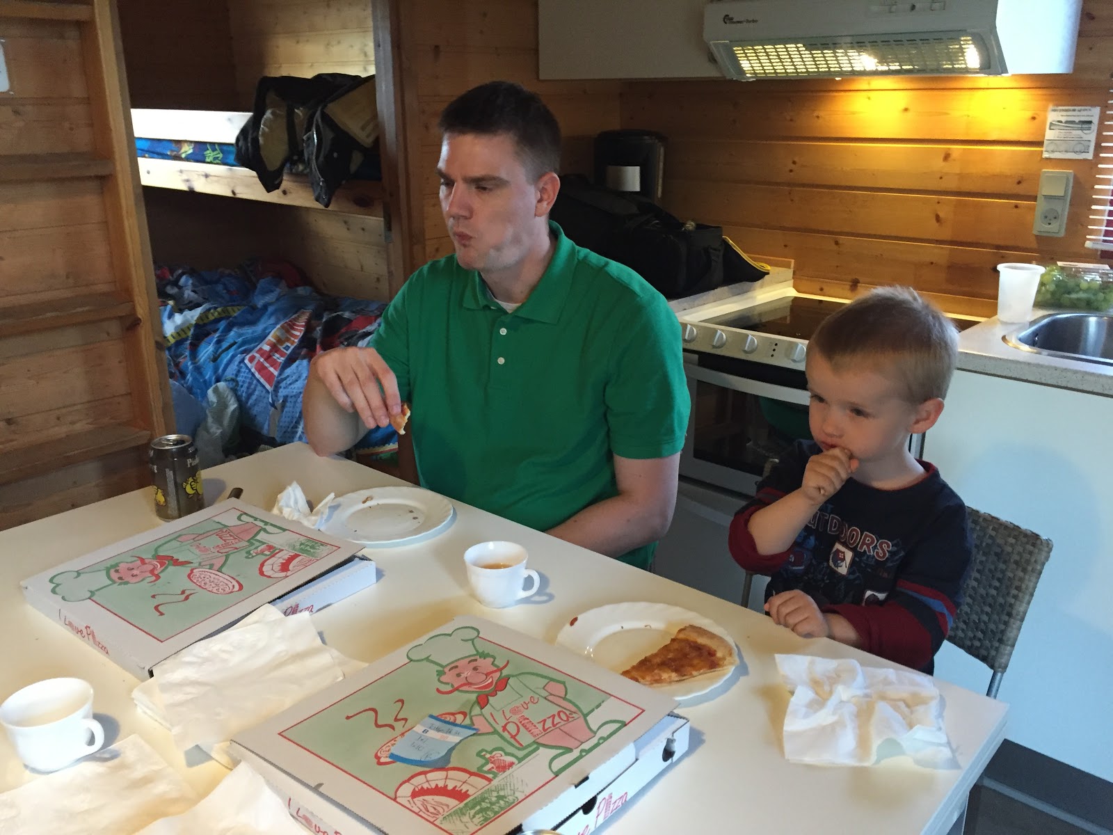 Since we arrived around supper time, we let the boys play on both playgrounds: one by our cabin and the other by the main building, before we stopped at the restaurant in the main building to get pizza for takeout. We even checked out a play building that they had with lots of fun things to keep the boys entertained before heading back to the cabin for a pizza supper.