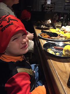 At first, the hostess was going to set us back a bit from the stage, but I asked if we could go farther up for a closer view. She then led us to the front of the table, where only one other family was in front of us. We had a great view. It was here, that a “pirate” approached us about having my little guy come up on the stage to “shoot a gun” for a part of the show. How exciting!! We sat down and waited for the rest of the people to take their seats before the show started. Bottles of beer and two different juices bottles were already on the table. The beer was Carlsberg Green and the juices were some type of fruit punch (red) and a pineapple drink (yellow). There were also rolls with butter and salad with various dressings (creme fraiche and thousand island) on the table. They were spread out so that they were in front of every 4th person. Almost immediately, the food was brought out to the tables. It was served in a family style, with a large try of meat (frikadeller, sausages, chicken legs) and corn on the cob being placed at about every 4th person. The last thing to come out was a large bowl of french fries. We all took turns helping ourselves, and the waitress brought out extra food when we ran out. There was a lot of food, so everyone really had their fill.