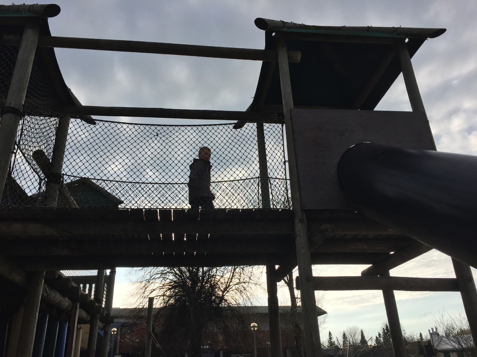 I have to say that Denmark really knows how to make themed play places. This place was amazing! Right way, we could see a stairs leading up to a rope bridge to the left and a “swamp” with a crocodile to the right (Fake, of course.). We walked the whole play area to find the different statues, pictures, etc. The boys climbed ropes and walked over various types of bridges.