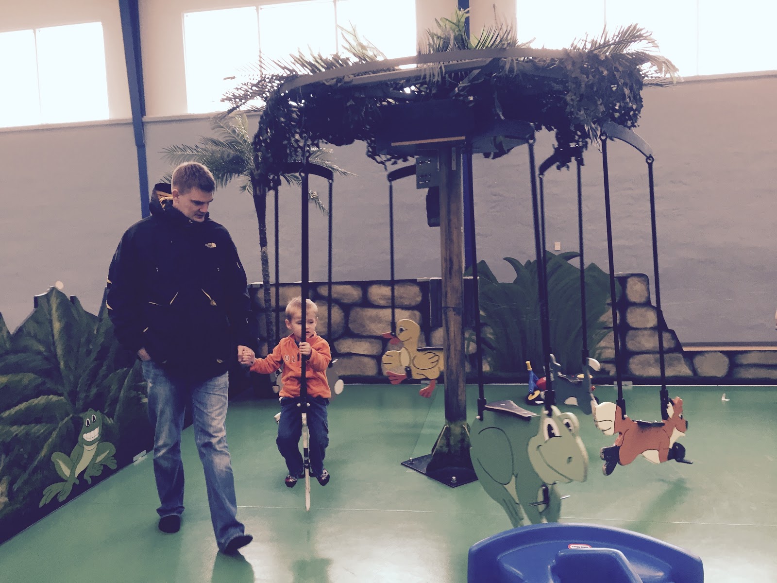 After braving the showers alone, which is actually better than doing it with two small boys, I met my family in the hallway to pick up our shoes. This was, of course, when I decided to take some secret pictures of the indoor waterpark. You can also see a glimpse of the outdoor waterpark, which wasn’t open yet. It was in the 40s (fahrenheit) when we were there, so the outdoor section was closed with no running water. It had a large, orange octopus that was a large water slide for the little ones. It seemed interesting, but we would have to come back and try it when the weather gets nicer. We were all hungry by this point, so we headed back to our cabin to make lunch and take a well-needed, family nap! 🙂