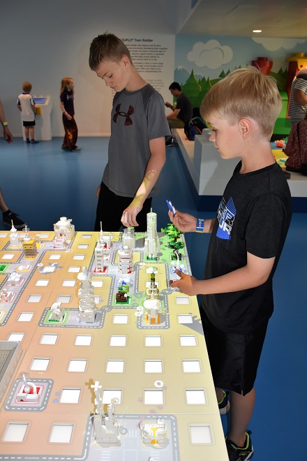 The other large display was a very large LEGO City scene. It is amazing how they can do to make it look real. It was as if we were in the middle of the LEGO movie. The boys also loved the building stations that they had there. The first station was all about working together to create a community. What a great idea. The boys took a small, flat piece and used white LEGO pieces to create a building to set on a electronic table to extend a city. It was such a cool part of the entire experience.