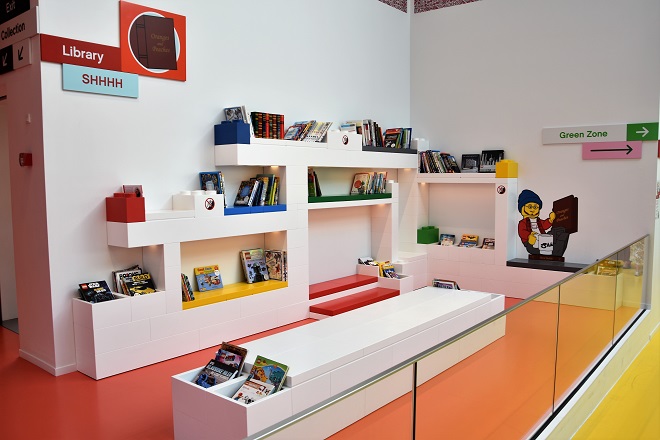 Another place within the Red Zone was called the Creative Lab. This area had tables set up with LEGO dots and small boards in the center. Here, you could create your own masterpiece to put up on display. There is also a place with books where children can read if they want a quiet moment!