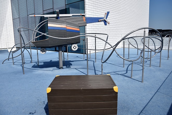 During our trip within the different, colored zones, we noticed that there were doors leading to the outside. These outdoor spaces were rooftop playgrounds with a variety of different themes that seemed to match the area we were in within the building. It was a nice break from being inside as well.