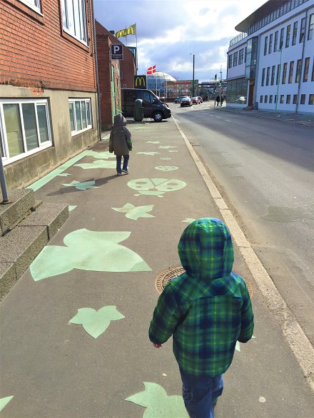 At this point in time, we had only gone a few blocks, which was all the distance we were away from the car in the lot at the Randers Regnskov. The path from the church to the Regnskov, however, was decorated with leaves and bugs. The boys loved this! “Don’t step on the bugs!”, they said!