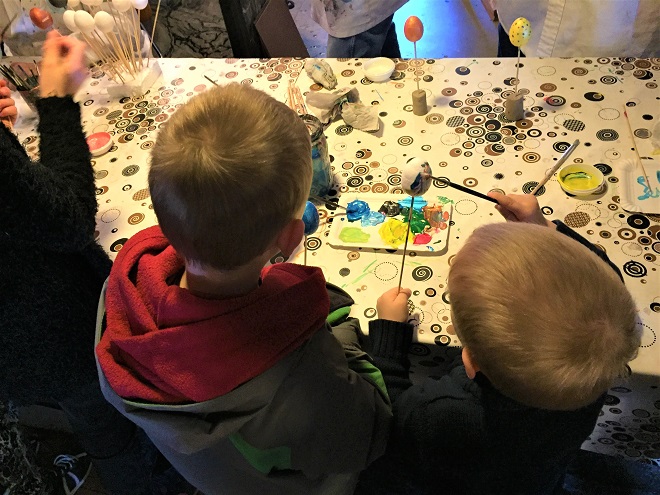 The next level had paint, clock making, and stone carvings. This is where the boys decorated eggs! Instead of dipping hard-boiled eggs into dyed water, they picked up a paint brush and painted Styrofoam eggs. They had a great time with this! They love painting!