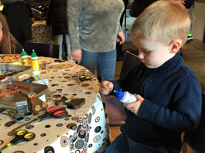 Both of my boys picked brown bunnies, which also had a string at the top for hanging. Many of the decorations were made out of wheat and other items were things like balls, beads, and googly eyes. With the help of a volunteer, big brother fully decked his bunny, but little brother decided that less was more. 🙂