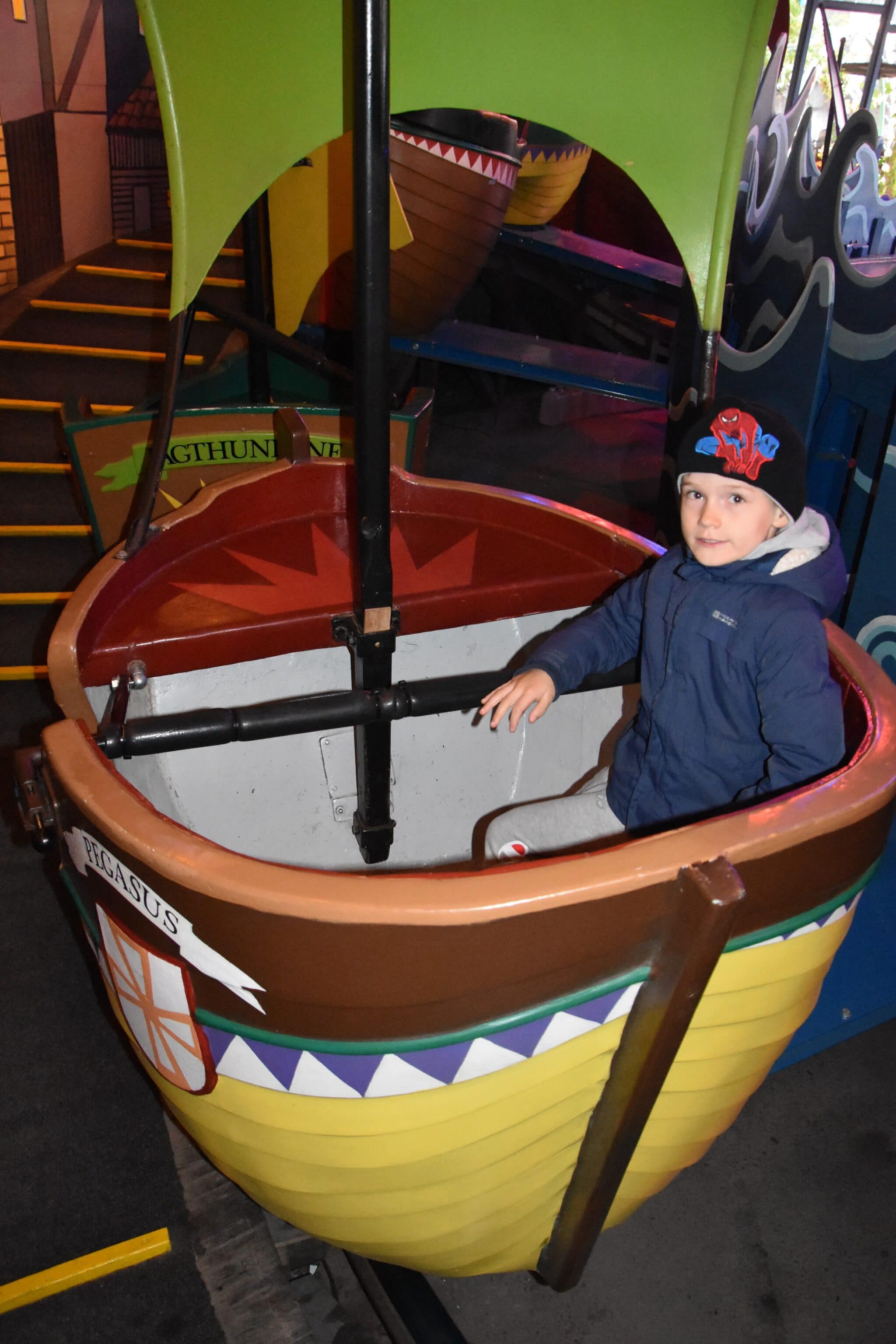 For some reason, my youngest was not having it on this ride. We had to ask the controller to stop the ride before we had our allotted number of rides around the circle because he thought we was going to be sick. I had seen so many other children on this ride with adults, who seemed to have a great time. My older son was one of these happy kids, but it just wasn’t my younger son’s favorite. I couldn’t believe he loved the spinning of the pirate ship over this. In my opinion, this was much easier than the pirate ship. Who knows!