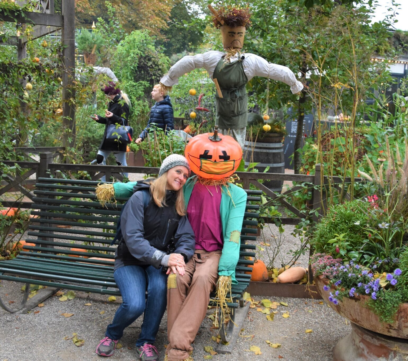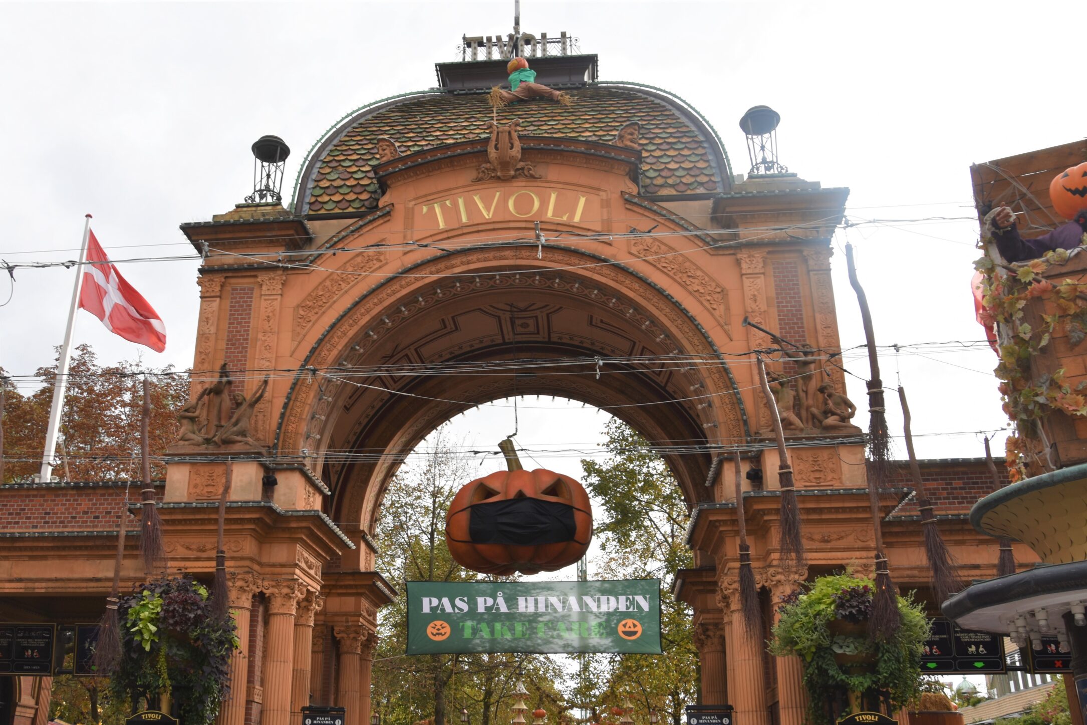 The main entrance to the Tivoli Amusement Park had lots of fun jack-o-lanterns and other Halloween decorations for us to look at, but many of these decorations were a bit different this year because of the current pandemic situation. The jack-o-lanterns had face masks. I thought this was a nice touch to make the whole “corona thing” seem kind of normal and accepted.