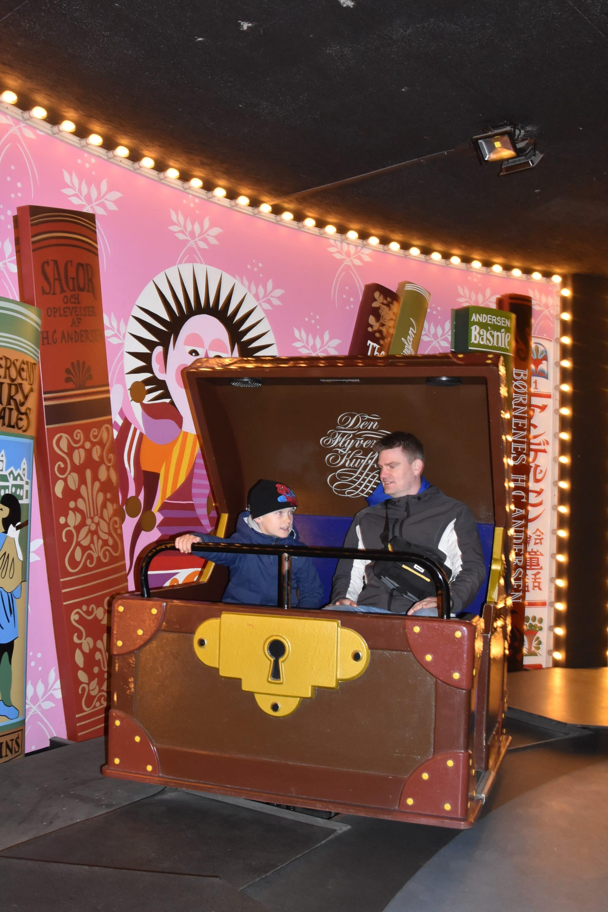 We walked down some stairs to get to the giant suitcases. These would take us all throughout the world of H.C. Andersen. Each suitcase holds 2 adults and 1 child. We decided to split up and put one parent and child in each suitcase. We also changed the language of the speaker from Danish to English. This is easy to do with the push of a lever at the top of the suitcase. It was very nice to have this feature, since not all travelers to Tivoli understand Danish.