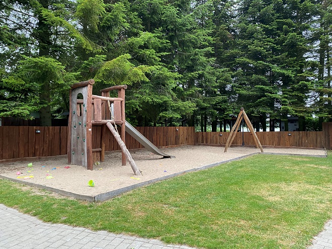 Next to the main building, you’ll find a nice wooden, playground with a climbing tower, slide, and swings. The space around this playground was a large sandpit with sand toys.