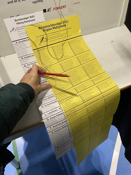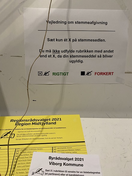 You will cast your vote for two positions for a local election in Denmark. These are for your local municipality (Kommune) and for your region. My region is West/Central Jutland (Vest-og Midtjylland). For the local municipality election, you are voting for the person who will take the highest seat in your municipality. This person is in charge of things that affect your “kommune”, like schools, daycares, roads, urban development, cultural events and nursing homes.