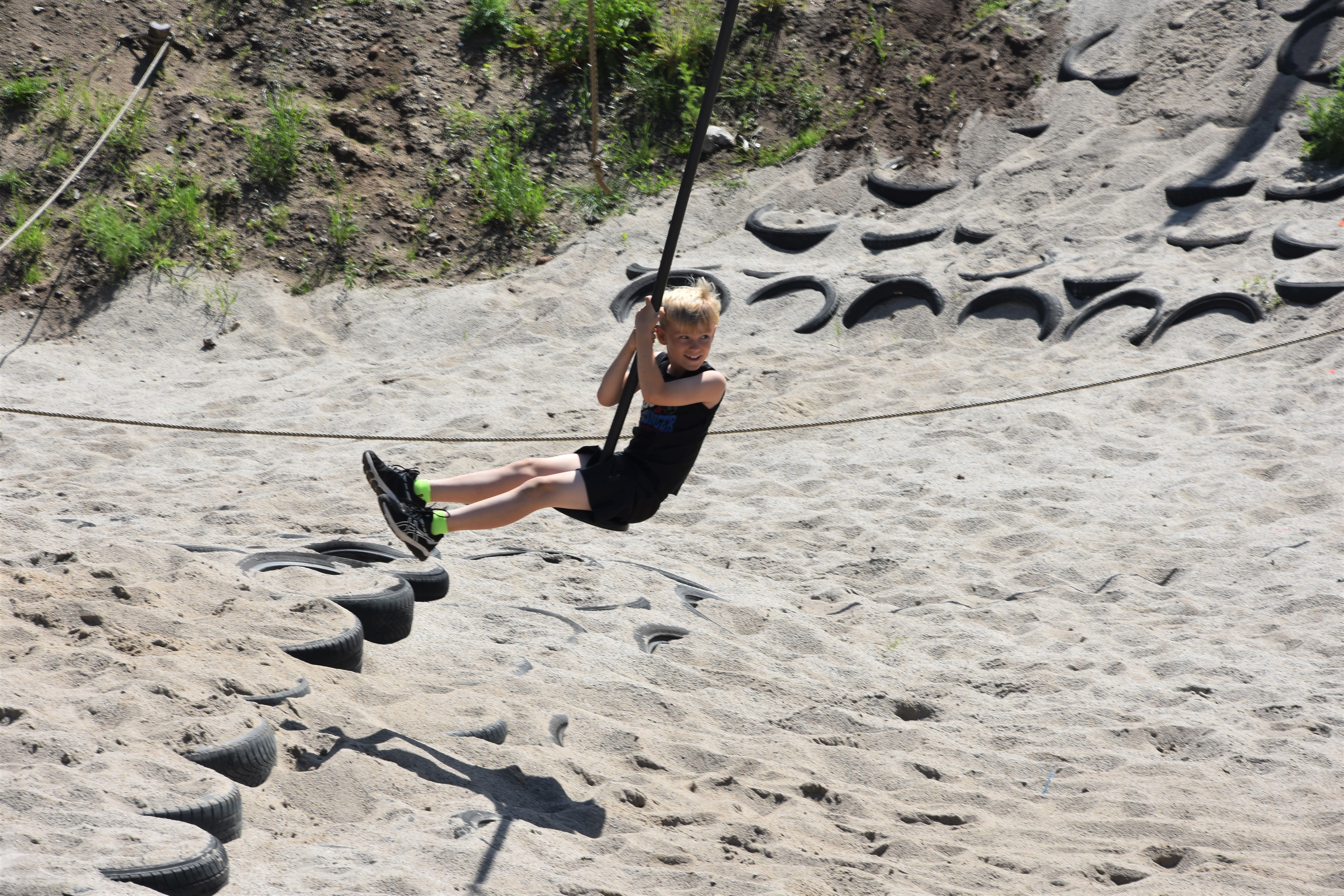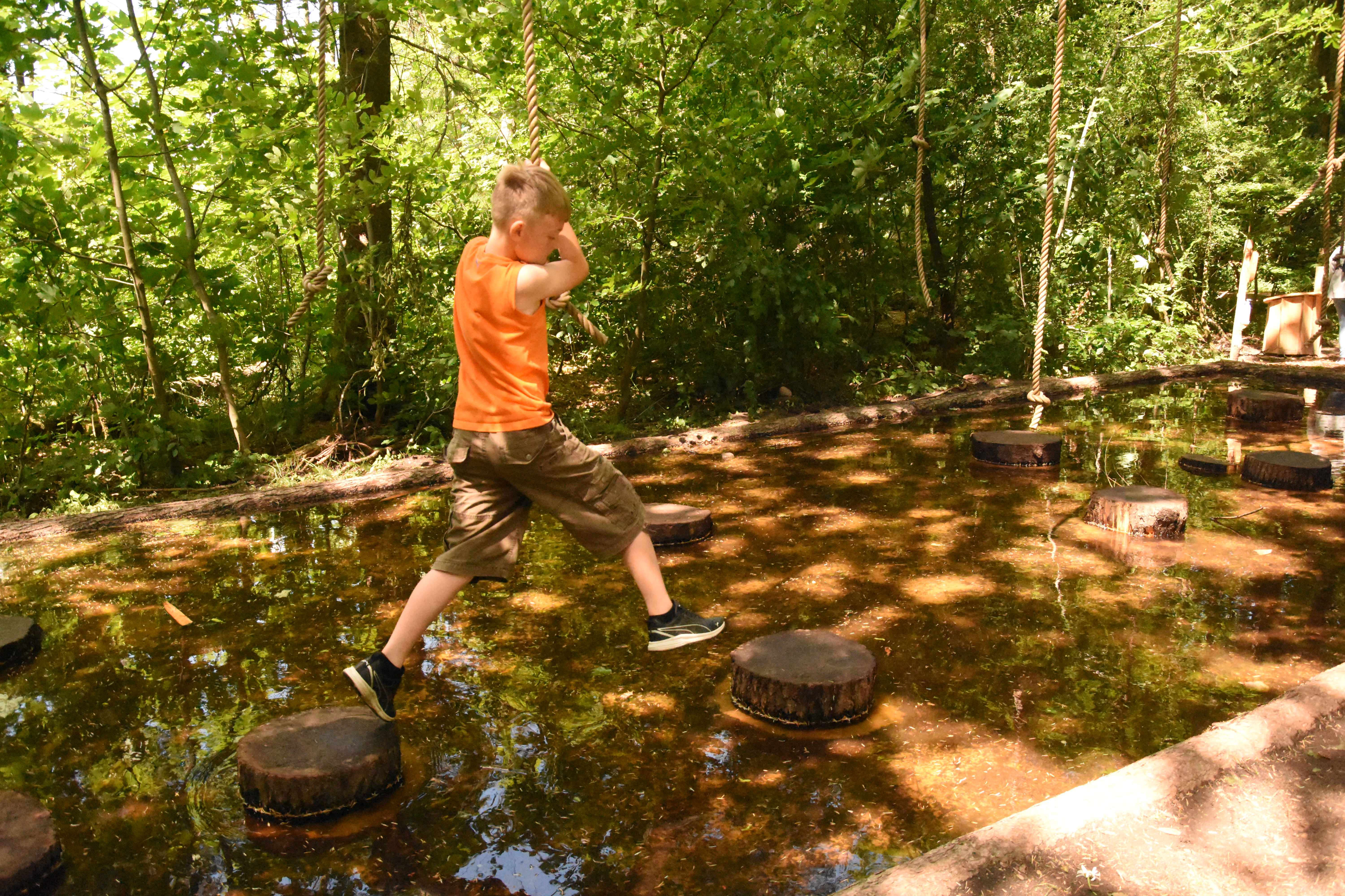 Getting a little bit more than halfway, he missed a stump and started to swing back and forth while his shoes landed in the water. After some encouragement, he finally made it to the other side. We loved the fact that he didn’t get upset and even felt that he wanted to give it another shot after he saw two boys his own age finish the course with no issues.