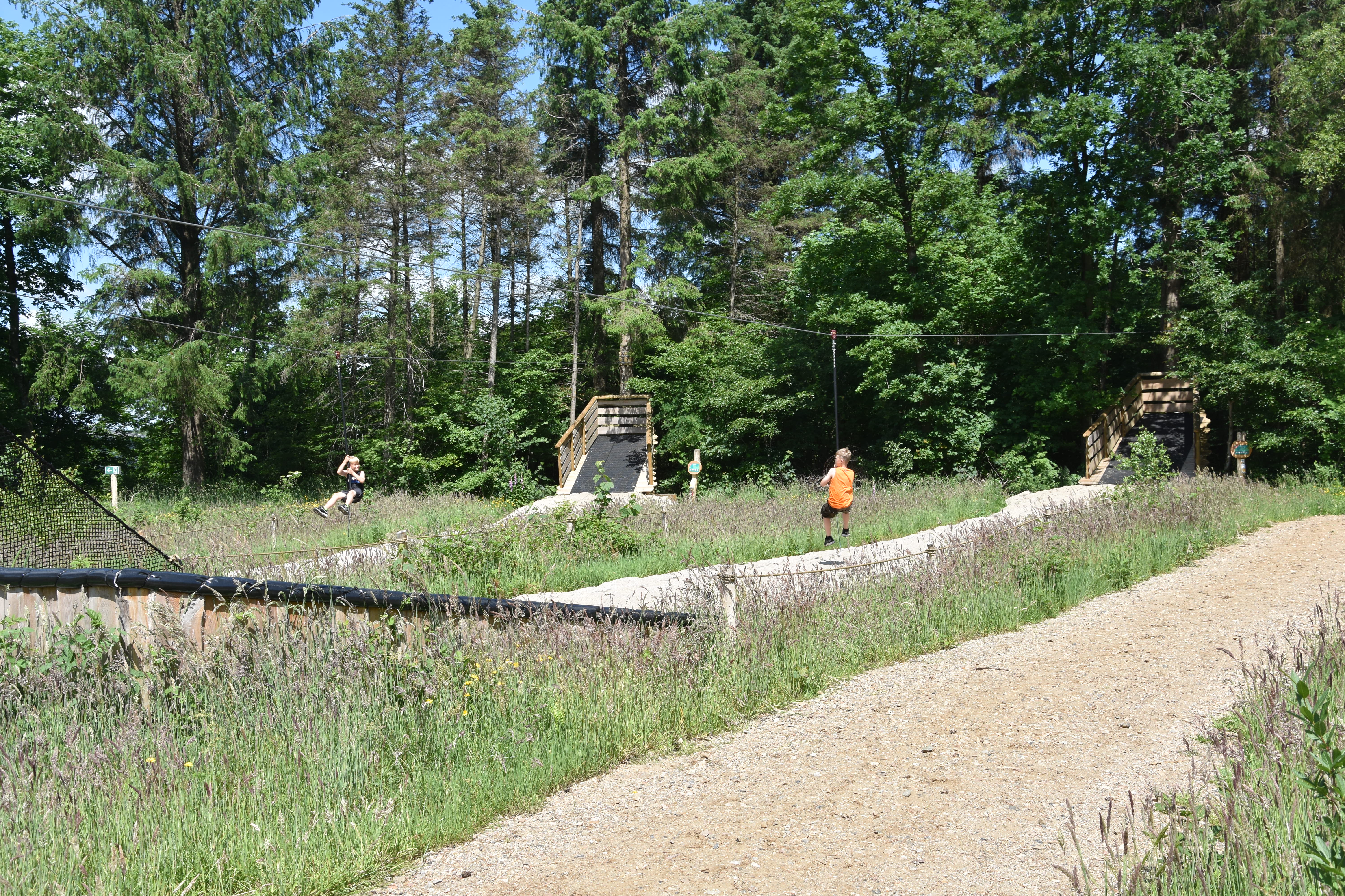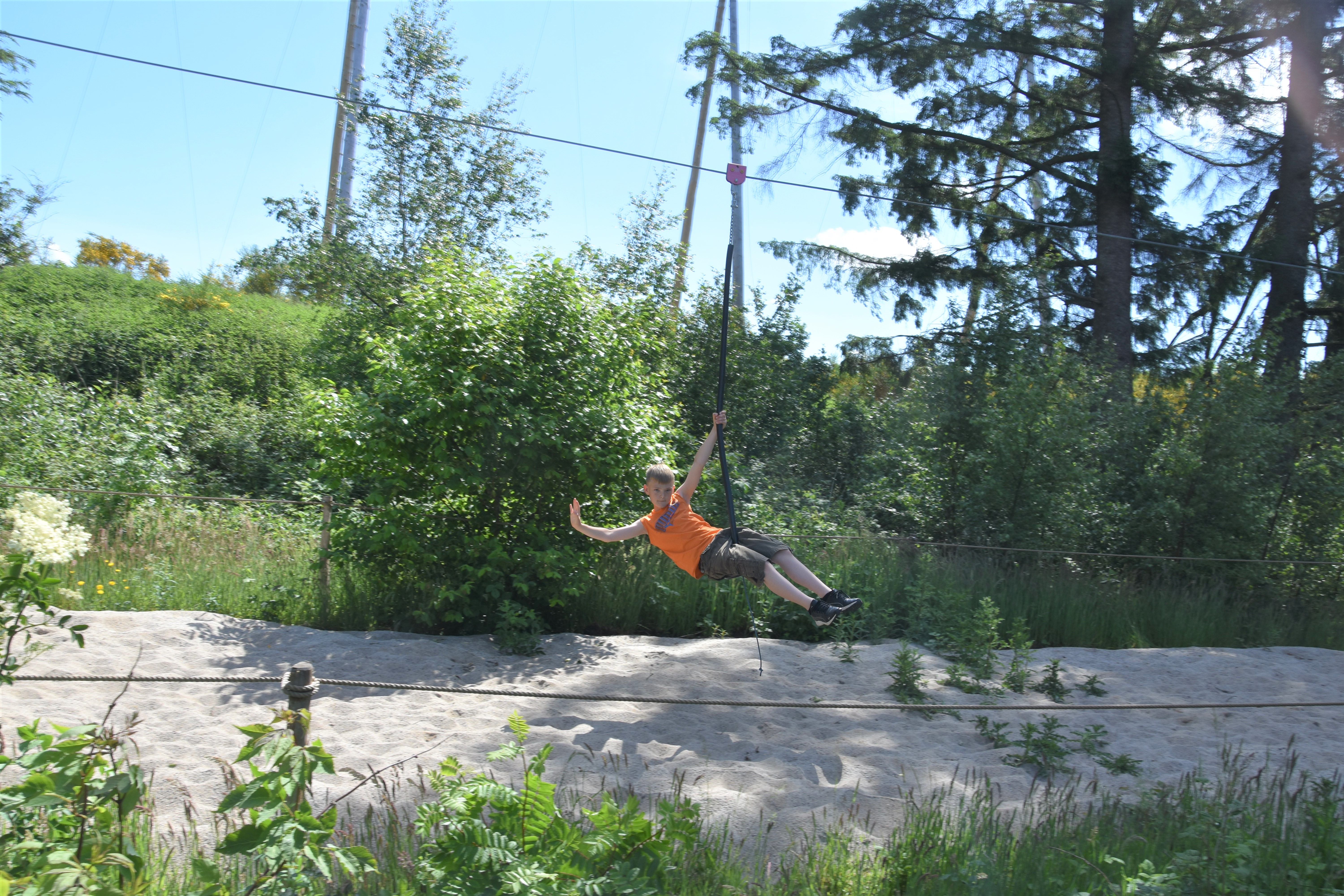 Luckily, the next spot on the map of WOW PARK Billund was a cluster of four ziplines called Svalerne, “the swallows”. If my boys were wet from the Vandedderkoppen, they were dry after multiple turns on the Svalerne which airdried them quite nicely on this very warm, summer day in Denmark.