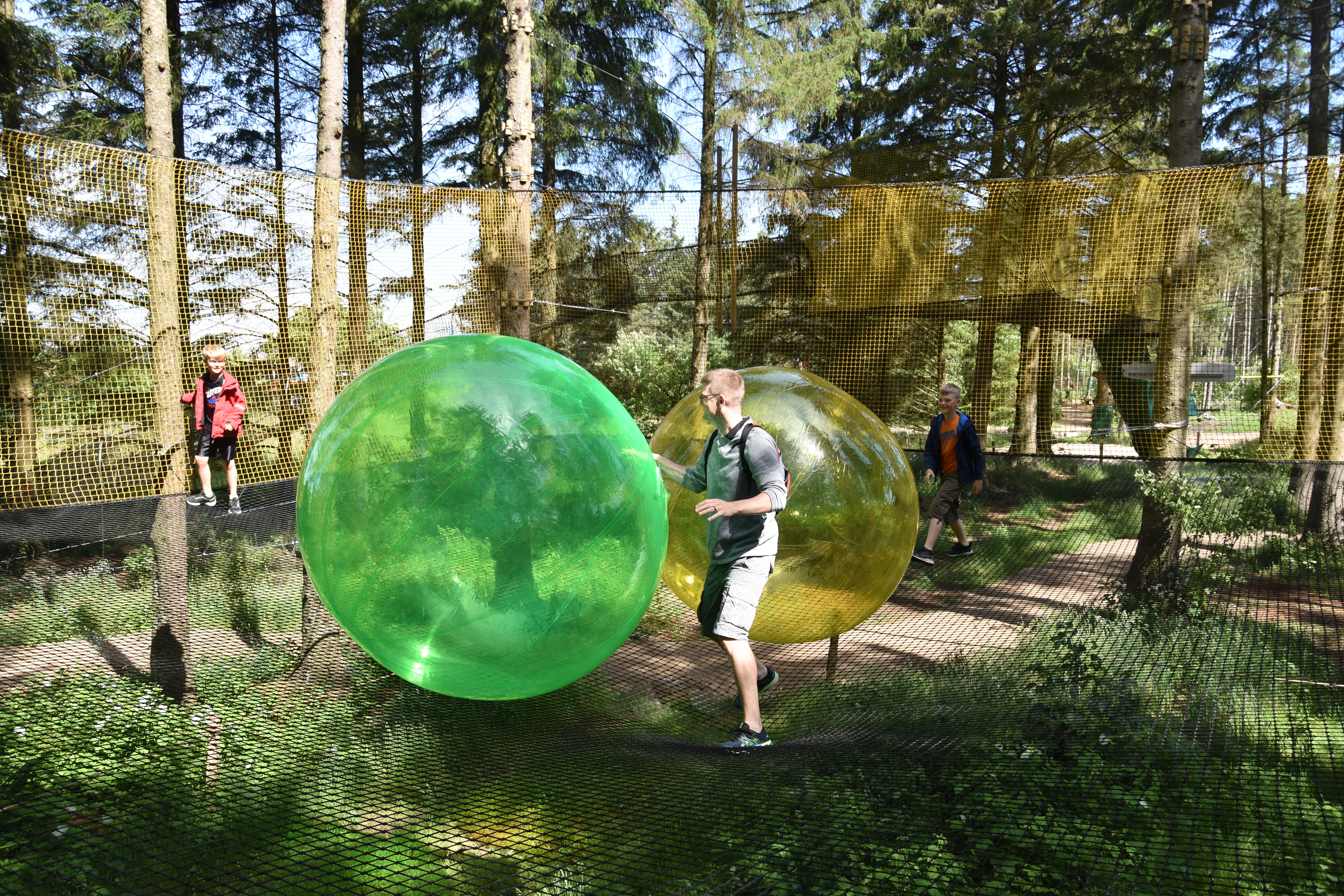 As we made our way through this beautiful, forested area of Midtjylland, we tried more of the fun attractions. The boys were very excited to try the Gudsmeden net. This was a double-decker net with a slide at each level. Their dad really enjoyed playing with them and the gigantic balls. It was very funny to watch them chasing each other from down below.