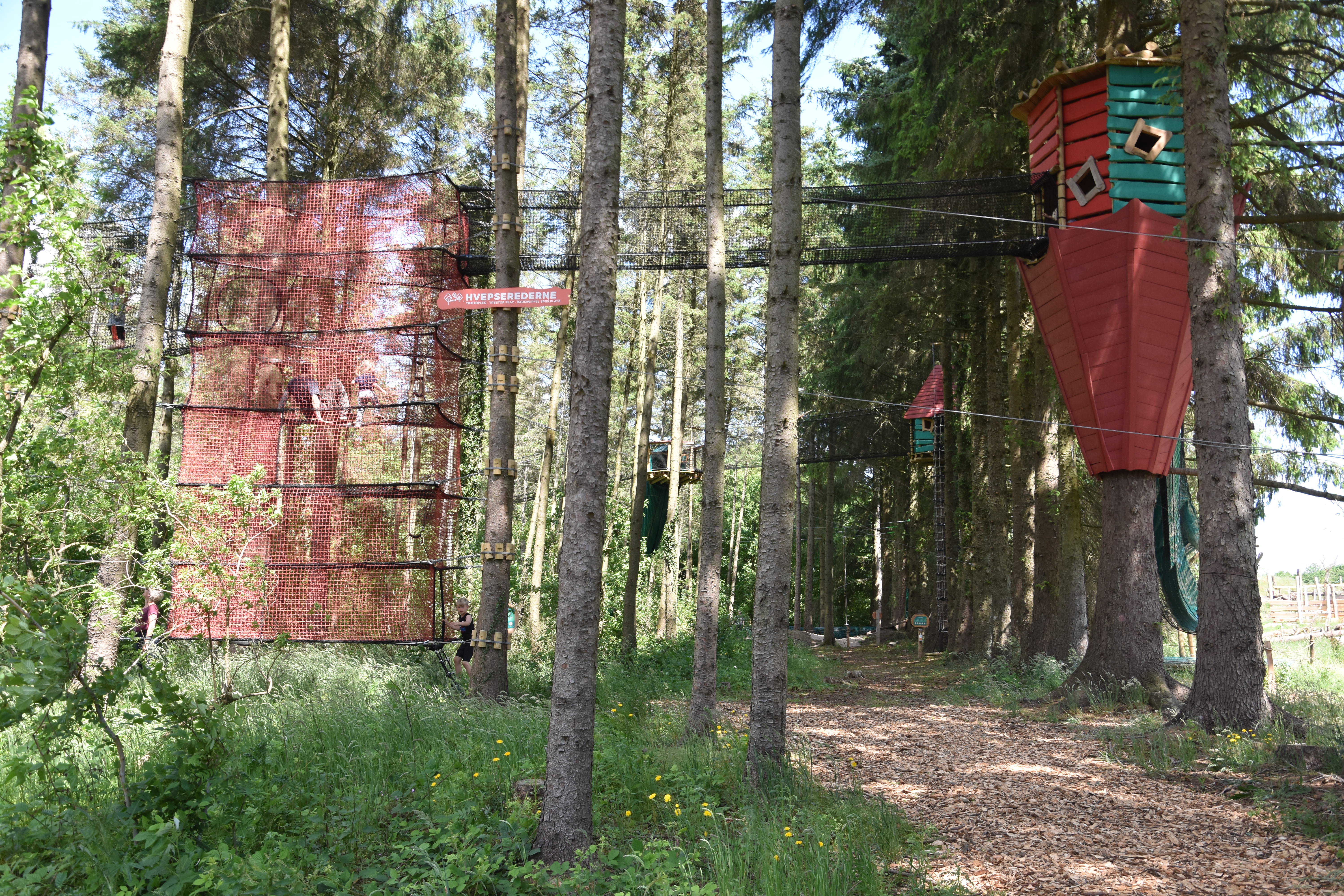 I tried to make my way around the course to the end to meet them there, but I must not have studied the map very carefully, because I didn’t anticipate how long this area was. Hvepserederne not only had 5 treehouses in total, but it also had three slides and rope bridges to connect it all at the top.