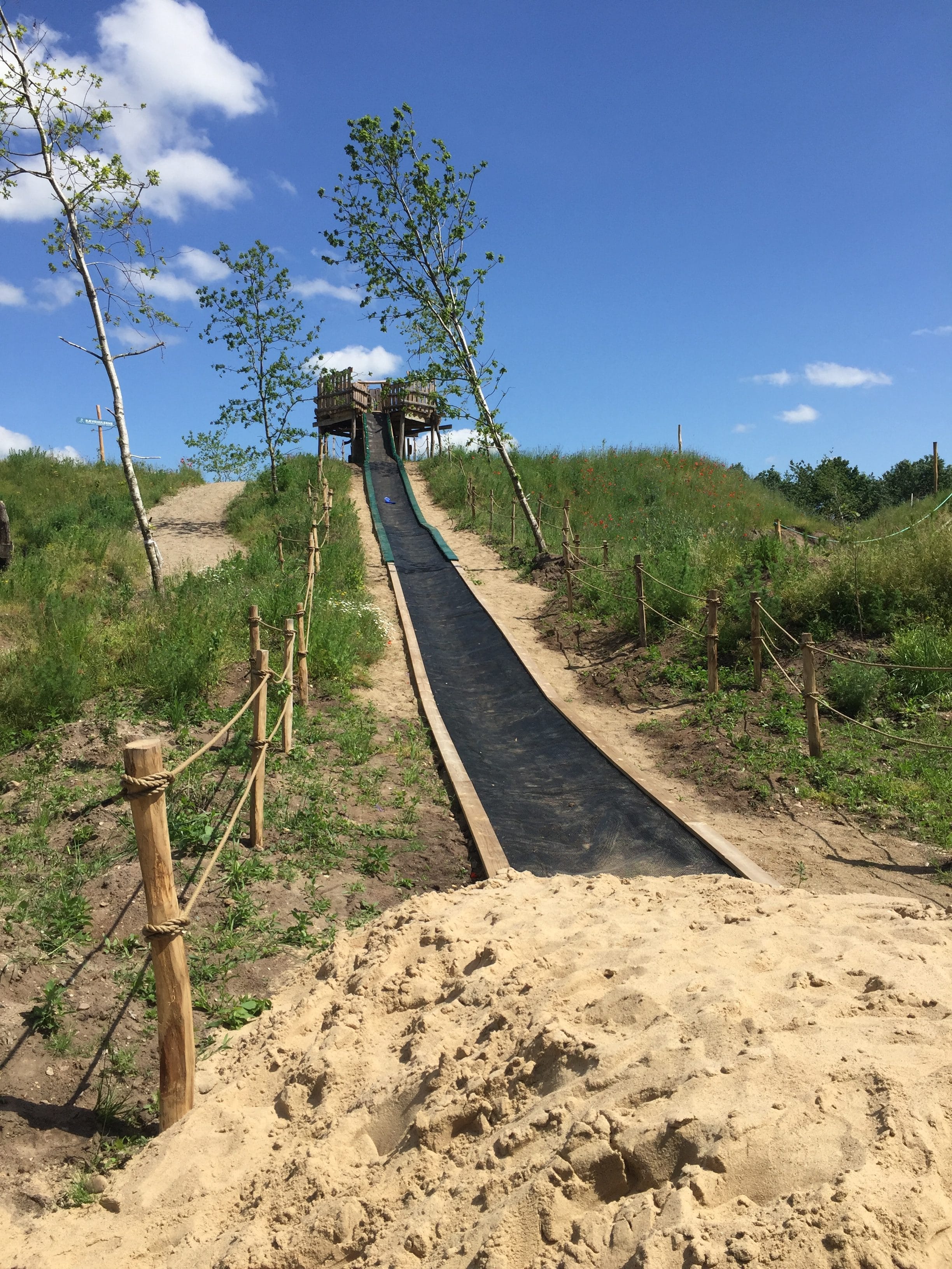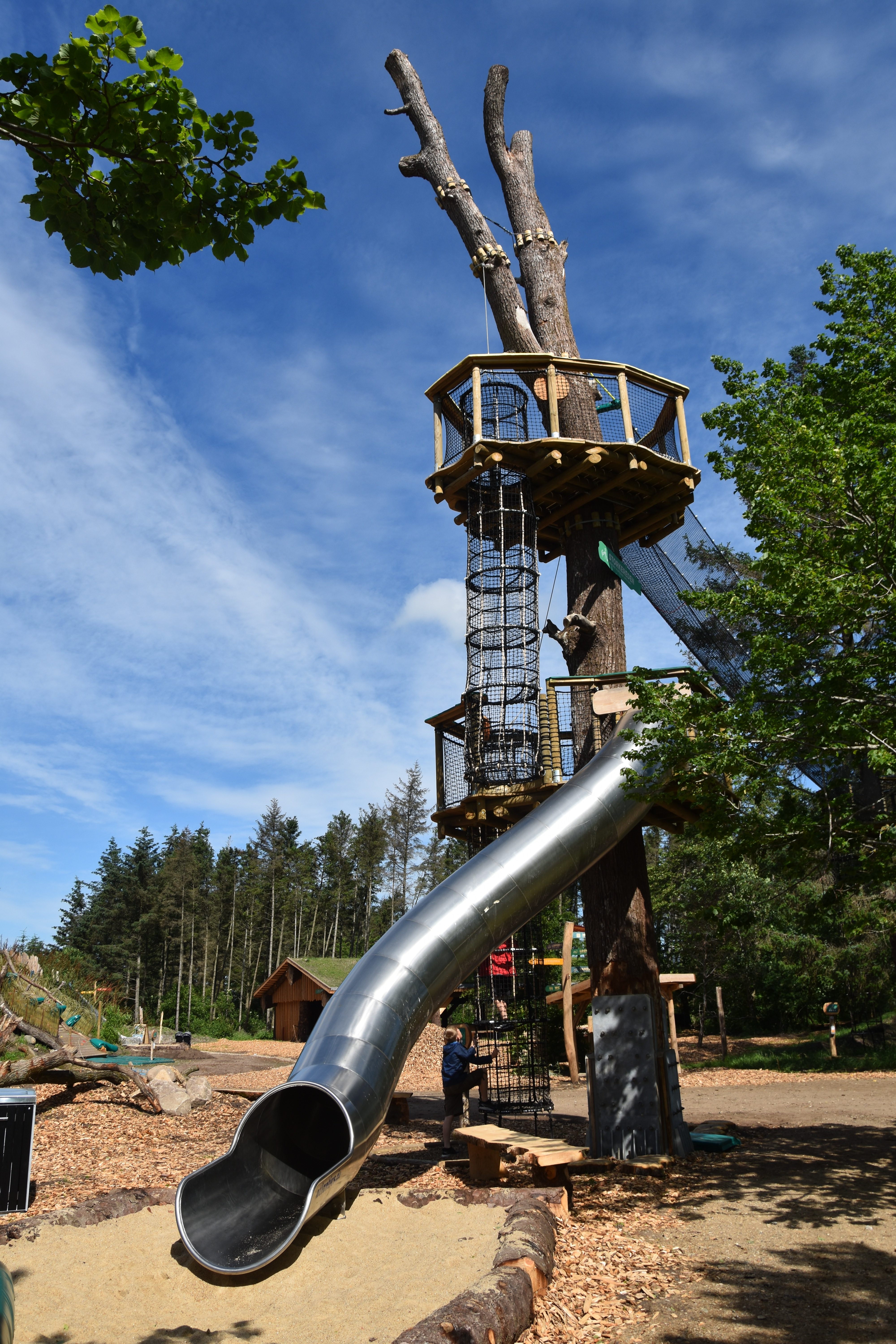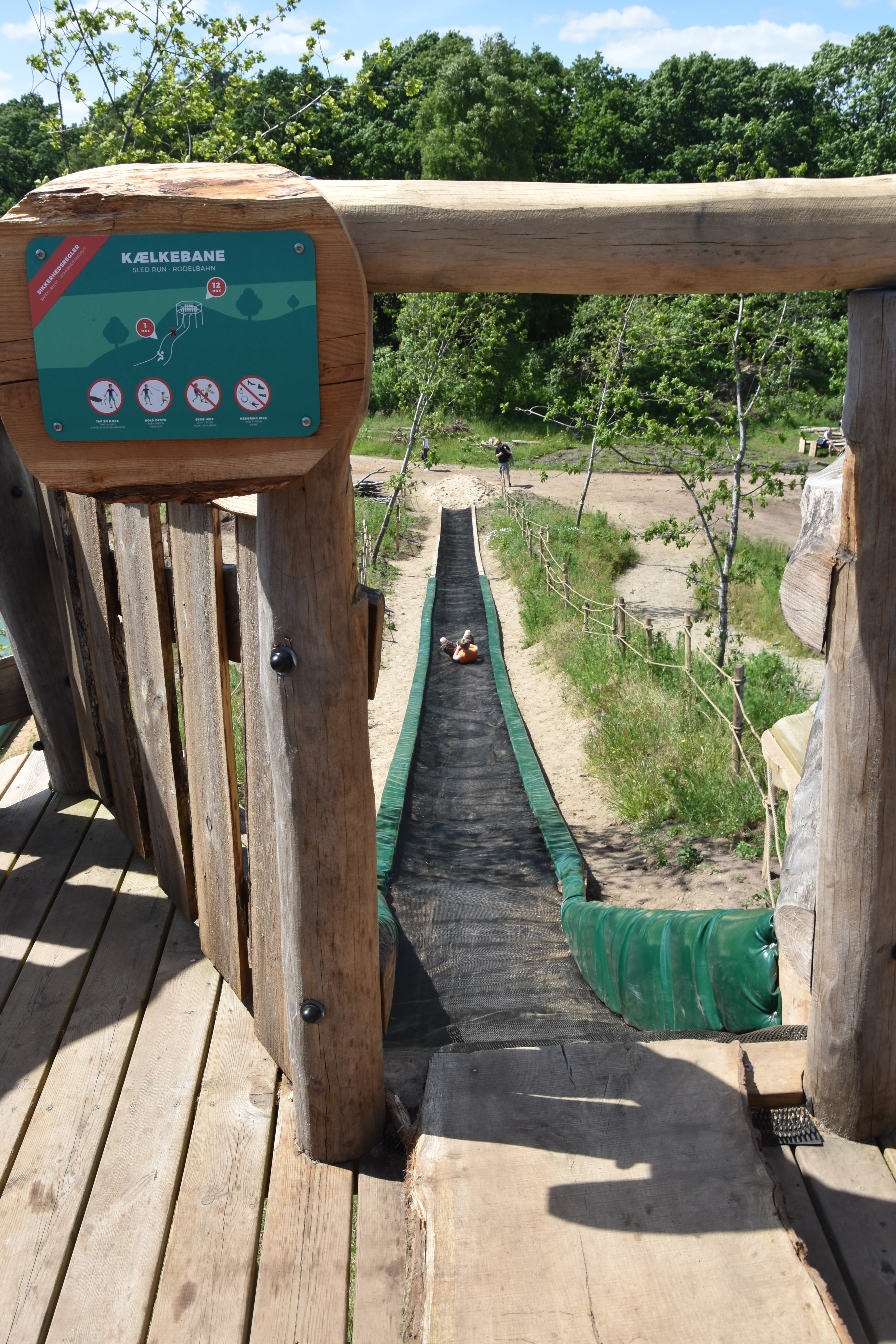 I have to admit that my attention was starting to be drawn to the largest hill in that section. This is where a tower stood with a very long, black slide-looking path going all the way down to the main path of the “zone”. This attraction was called Skruptudsen, which was Danish for “the toad”, and had a slide that was nothing like the slides we had seen on the treehouses.